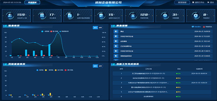 構(gòu)建可視化數(shù)據(jù)中心看板集成匯總企業(yè)安全生產(chǎn)運(yùn)行數(shù)據(jù),涵蓋隱患情況、風(fēng)險(xiǎn)巡查情況、工作完成情況、預(yù)警預(yù)告情況、到期提醒、物聯(lián)報(bào)警等,便于負(fù)責(zé)人全盤掌握企業(yè)安全管理動(dòng)態(tài)。