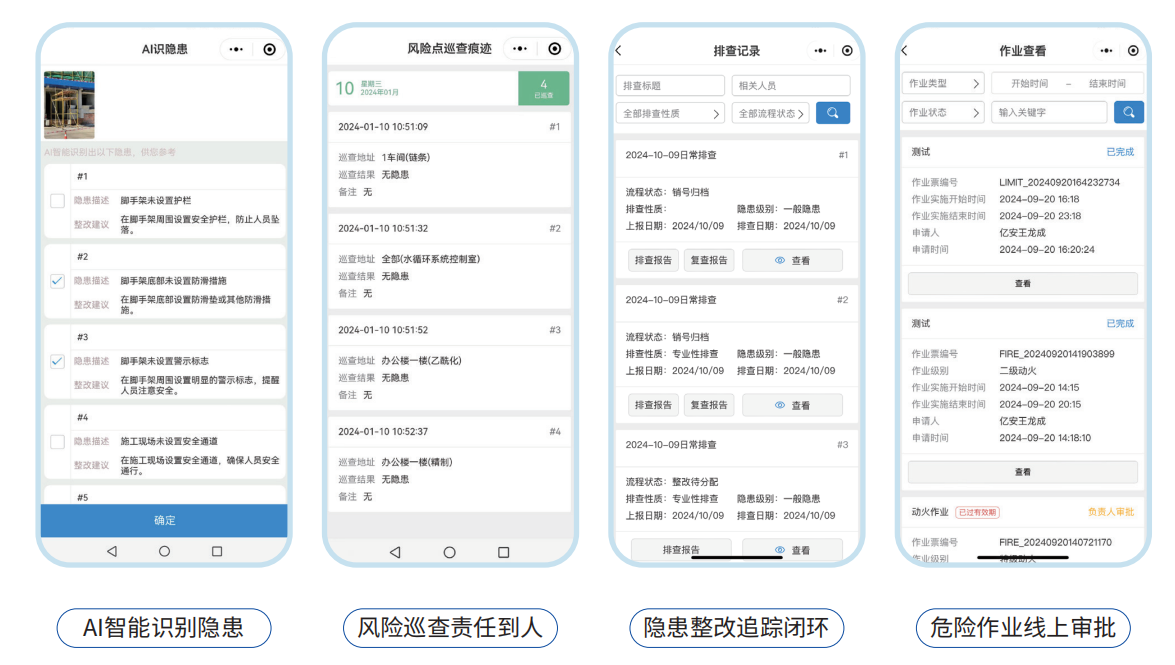 在移動(dòng)小程序端,支持實(shí)拍或上傳現(xiàn)場(chǎng)隱患圖片,利用AI識(shí)圖一鍵出結(jié)果,對(duì)應(yīng)隱患描述、整改建議一目了然,安全小白也能輕松上手,快速完成隱患排查,有效解決檢查人員專業(yè)度不足的問(wèn)題。