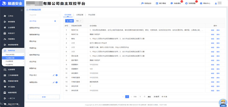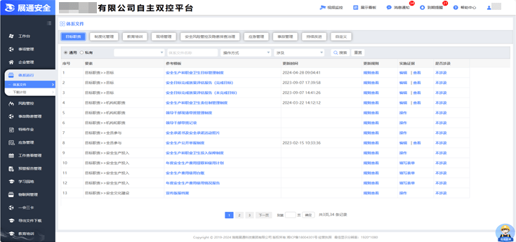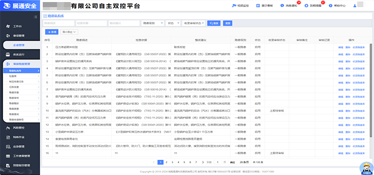 系統(tǒng)提供企業(yè)基本信息、安全管理架構(gòu)、安全投入、涉危情況、行業(yè)資質(zhì)、安全培訓(xùn)、職業(yè)衛(wèi)生、涉塵涉爆、有(受)限空間、第三方檢測(cè)、檢驗(yàn)等15個(gè)功能模塊,可根據(jù)企業(yè)實(shí)際情況進(jìn)行選用。